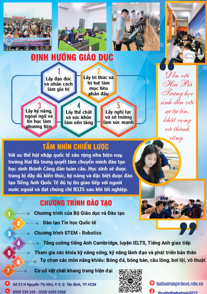 Trường THCS – THPT Hai Bà Trưng tuyển sinh từ lớp 6 đến lớp 12 với diện nội trú, bán trú, hai buổi. Hai Bà Trưng là trường tư thục chất lượng cao tại quận Tân Bình nhiều năm liền đạt thành tích cao trong kỳ thi tốt nghiệp THPT. Trường tuyển sinh lớp 10 theo hình thức xét tuyển, không thi tuyển. Học sinh được lựa chọn các môn học phù hợp, từ đó sẽ mở rộng cho các bạn cơ hội theo đuổi nhiều ngành nghề trong tương lai.